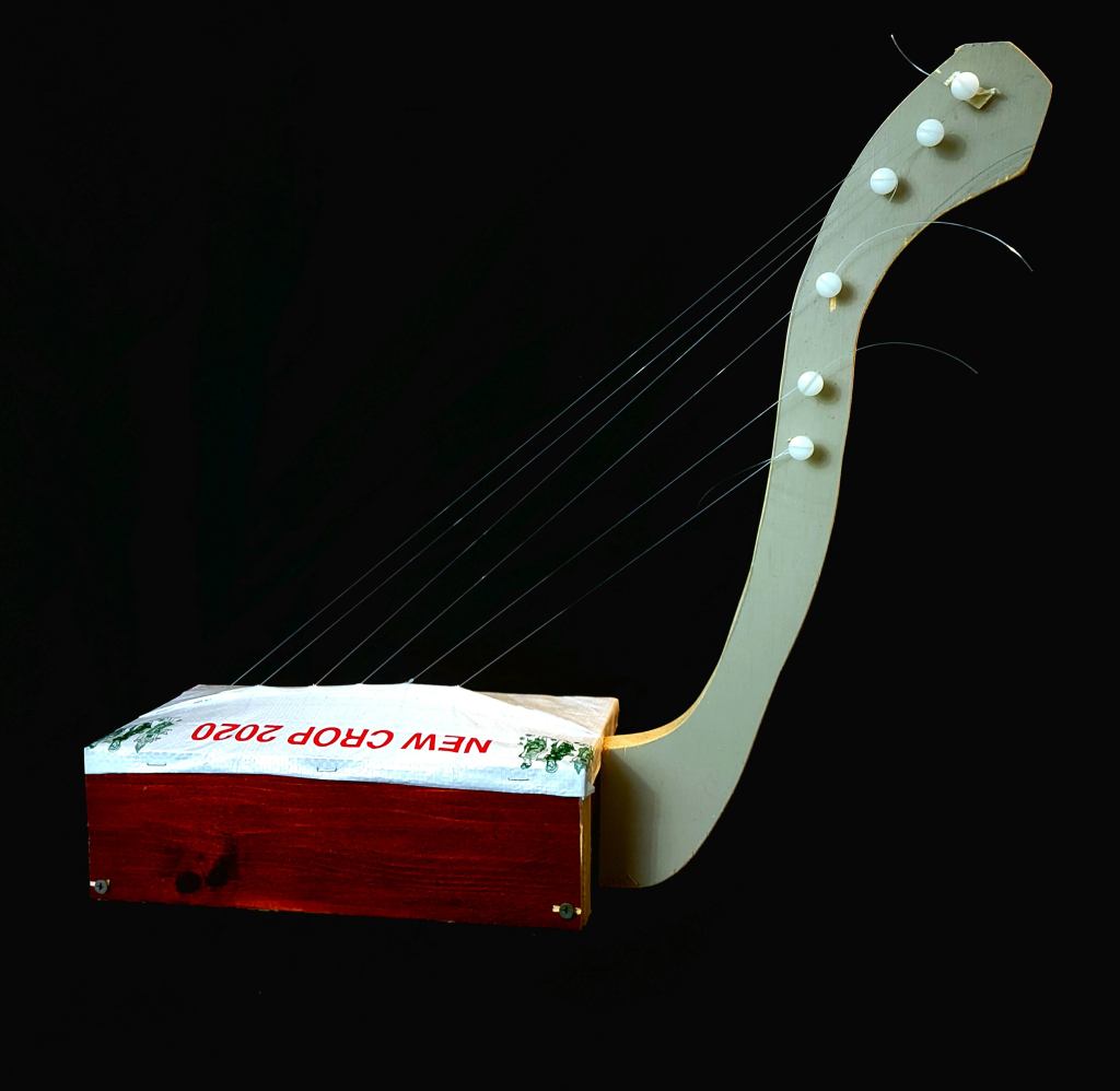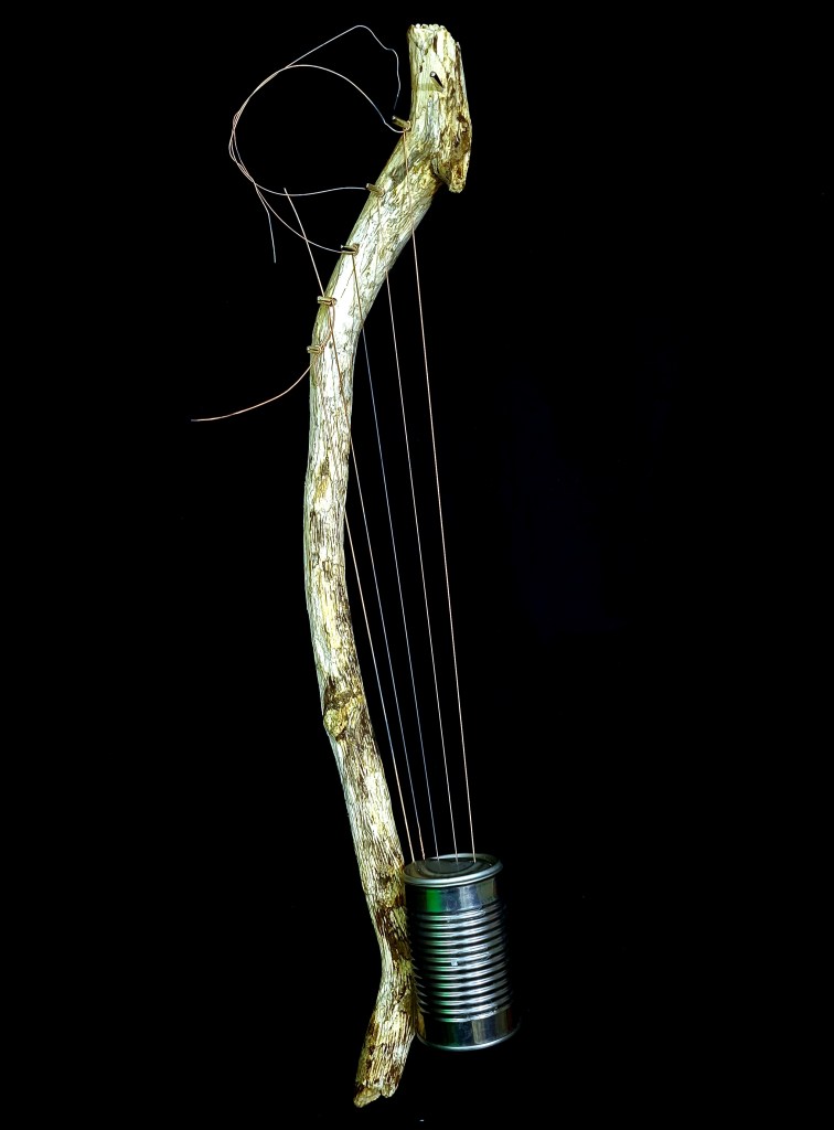 The tehnaku constructed for this song points to food through the use of a soup can for its main resonating body. The curved branch was found on a hike in the mountains (as a nod to the earlier hta: Khu law sè loe thi chà pu, Sè de kè ke te-nà-ku, or “head to the headwaters and mountains, and if you see a curved branch, make a tehnaku”).
