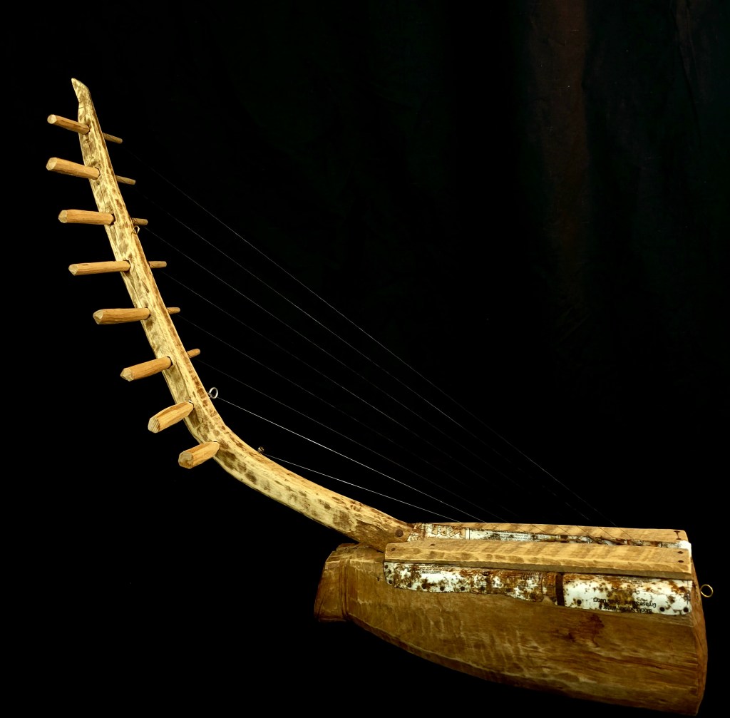 The traditional lyrics present the basic elements and materials of the instrument: teak wood, animal hide, rattan vines, and the voice of the instrument itself, said to sing out “Kru na na” or “kru kru” when plucked (potentially a reference to the sound of a dove). Heard on this track is a tehna made with fishing line, plastic bolt tuners, and a rice bag membrane.